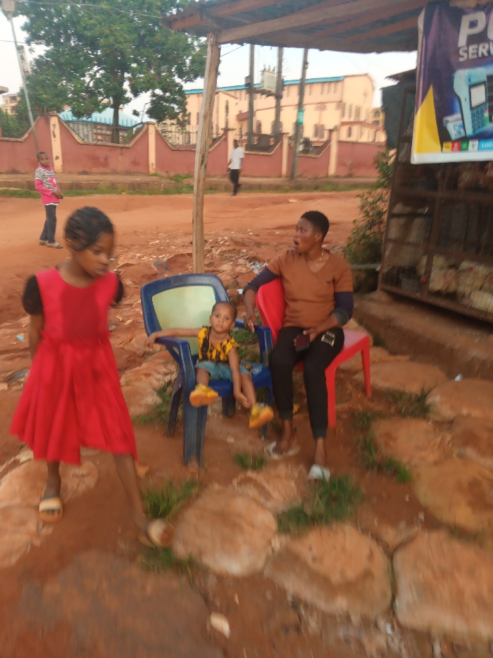 The image portrays an unpaved outdoor area in Onitsha, Nigeria, characterized by reddish-brown soil with scattered patches of green vegetation and large, irregular stones in the foreground. In the left foreground, a young female, approximately 6-8 years old, wearing a red dress with dark short sleeves and light sandals, is captured in mid-stride, partially blurred, looking towards the left. To her right, a very young child, likely a toddler, sits in a blue plastic chair, wearing a yellow and black patterned top, blue shorts, and yellow sandals, looking forward. Next to the child, an adult female is seated in a red plastic chair; she wears a brown short-sleeved top, dark trousers, and white flip-flops, holding a dark smartphone in her left hand, with her mouth open and gaze directed to the left, out of frame. To the far right, a makeshift stall structure with wooden supports and a dark roof features a purple banner with white text, partially visible as "P SERVICES." Below this banner is a dark shelving unit or cage-like structure containing light-colored items. The background reveals a wider reddish-brown dirt road. On the left side of this road, another child, wearing a striped pink and white shirt, stands near a low, reddish-brown wall with arched segments. Further back on the right side of the road, an adult male in a light-colored shirt and dark trousers is seen walking. Behind the wall and road, a large building complex with light-colored walls and a green roof is visible under an overcast sky.