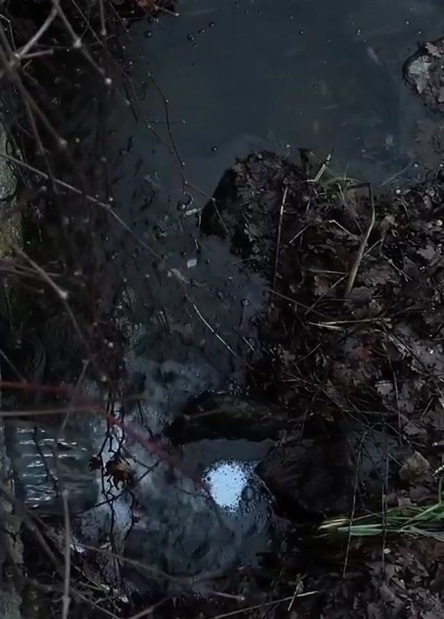 small stream flowing through a forest. The water is dark and reflects the light from the sky. There are leaves and branches on the banks of the stream.