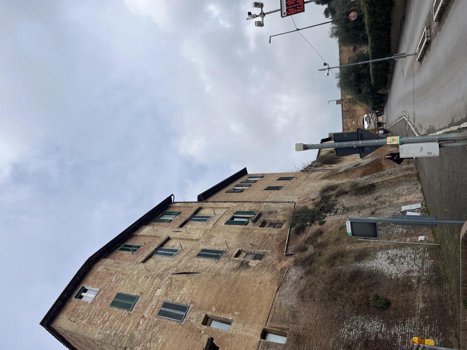 The image captures a street scene near Porta Romana in Siena, Italy, under an overcast sky