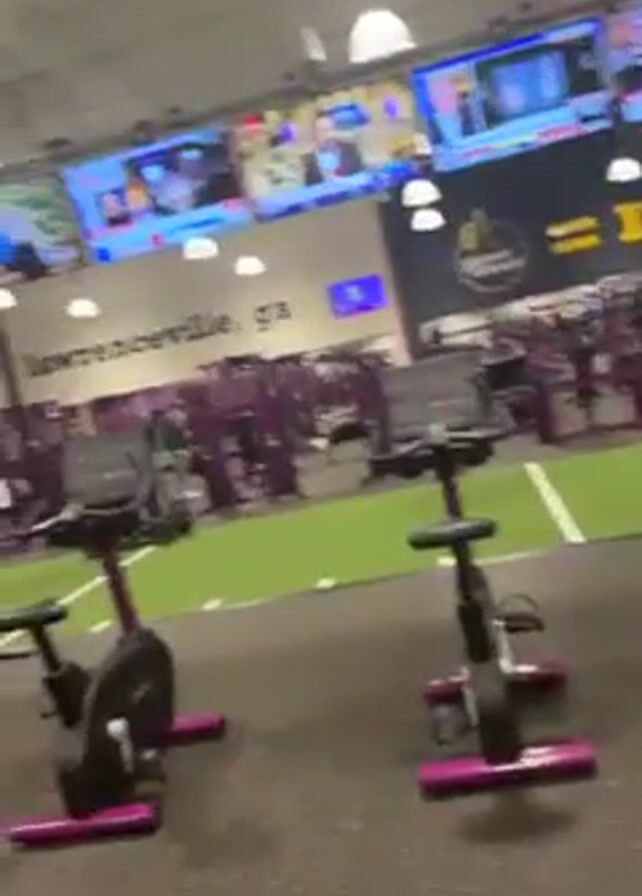 interior of a Planet Fitness gym. Several stationary exercise bikes are visible, arranged in a row on a dark gray floor. The bikes are mostly black with purple accents. Behind the bikes is a strip of artificial green turf. Further back are various purple gym machines. A large sign reading "= 10 critics" is visible on the wall. Above the sign, there is a series of television screens displaying news and other content. The ceiling is white with several dome-shaped lights. The camera moves slightly, focusing on the screens of the stationary bikes.