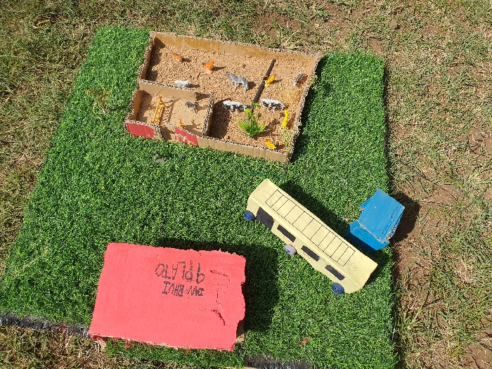 The scene depicts an outdoor display or project laid out on a patch of artificial green turf, which rests on natural dry earth with sparse grass. The setup is illuminated by direct sunlight, casting distinct shadows. Key objects on the artificial turf include: * A solid red rectangular block, approximately 30 cm by 20 cm, positioned on the upper left. It bears faded black handwritten text, including "JHA-BHUI" and "9 PLATO." * A yellow cardboard model, resembling a bus or train car, approximately 40 cm long, with black-marked windows and light blue circular features acting as wheels. It is oriented diagonally across the turf. * A smaller, blue-painted rectangular block, approximately 15 cm by 10 cm, partially visible beneath the yellow vehicle model. * A rectangular cardboard diorama, approximately 50 cm by 35 cm, located on the right. It is partitioned into multiple compartments containing a light brown granular material, likely representing soil or sand. Within these compartments are approximately 10-15 miniature plastic animal figures, including various colored cows (white, grey, brown) and chickens (yellow, orange). A small green model tree and a miniature yellow trough or structure are also present. No people or direct interactions are visible. The objects are arranged statically, suggesting a curated display. The specific location within the city of Kisumu, Kenya, is not visually identifiable from the elements present in the image.