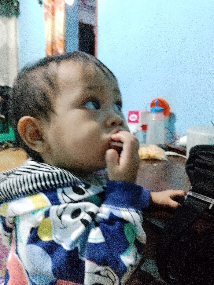 An infant or young toddler, with dark hair and light skin, is depicted from the upper torso, looking upward and to the right. The child wears a long-sleeved garment featuring a black and white striped upper section and a dark blue lower section adorned with multiple colorful patterns, including white and black cartoon motifs, and blue ribbed cuffs. The child's right hand is raised to the mouth, holding a small, light-brown, circular object. The left hand rests on a dark brown surface, identified as a table. Adjacent to the child's left hand on the table is a black object with a translucent buckle. Further on the table, a cluster of light-colored, irregular-shaped snacks is visible. The background consists of a light blue wall. Against this wall, a white rectangular object with a red circular emblem and a clear plastic bottle with an orange top are present. A blurred, orange and brown patterned curtain and a dark vertical element are visible on the left side of the background. The scene is located within a building in the city of Kecamatan Pati, Indonesia.