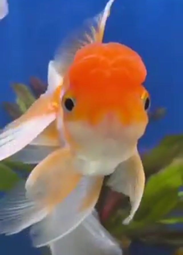 goldfish swimming in an aquarium. The fish has an orange head and a white and orange body. It is swimming towards the camera. The background of the aquarium is blue. There are other fish and plants in the aquarium.