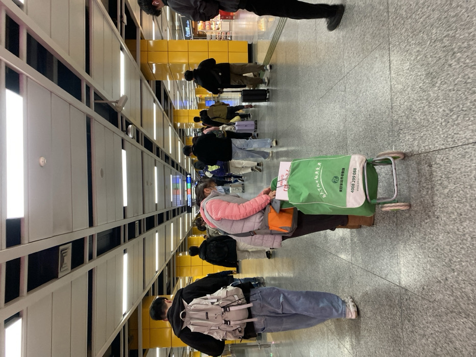 The image displays an indoor public concourse within Panyu District, China, characterized by a grey speckled tile floor and bright yellow square pillars. The overhead ceiling features a grid of white rectangular panels interspersed with dark, open slots, from which numerous long, recessed fluorescent lights illuminate the space. A white smoke detector/sprinkler head is visible on the ceiling. Approximately 15 to 20 individuals populate the scene, predominantly moving away from the camera. In the left foreground, a person is seen from behind, wearing a black hooded top, light blue wide-leg jeans, and white sneakers, carrying a light grey backpack with multiple straps and buckles. Slightly right of center in the mid-foreground, an individual, facing partially away, wears a light pink padded jacket over a grey garment, dark trousers, and brown boots. This person is wearing a light blue surgical mask and an orange shoulder bag, and is bent forward over a green fabric shopping trolley. The trolley has small white wheels and features white sections on its fabric bag displaying Chinese characters and the telephone number "4008 299 088". In the mid-ground and background, other pedestrians are observed walking, many pulling wheeled luggage, including at least one purple and one black suitcase. Distant illuminated signs with Chinese characters and colored directional indicators (red, green, blue) are visible. On the far right, a retail kiosk with shelves displaying various products is discernible.