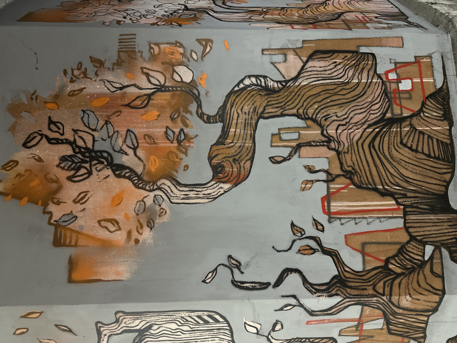 The image displays a multi-panel outdoor mural situated on an exterior corner wall within the city of Sofia, Bulgaria. The exact street address is not discernible from the provided imagery. The artwork depicts a stylized, autumnal-themed landscape dominated by large, gnarled trees with visible wood grain textures. The background is a uniform pale grey. The mural features several trees, with the largest central tree extending its trunk and branches upwards and to the right, appearing to grow from a base of abstract, geometric shapes rendered in shades of tan and brown, outlined in red and black, resembling an urban or industrial cityscape. The tree's foliage is depicted as a scattering of leaves, some merely outlined in black, others filled with solid orange or light brown, suggesting falling leaves. Evidence of spray paint application, including overspray and speckled textures in orange and white, is visible around the tree's canopy. To the left, another tree with a gnarled trunk and fewer leaves is present, similarly rooted in abstract brown geometric forms with red outlines. Smaller, younger tree-like sprouts with minimal leaves also emerge from these urban elements. The art style combines graphic black outlines for organic forms with sprayed colors for depth and texture. No individuals, animals, or real-world objects other than the mural itself are present in the immediate scene.