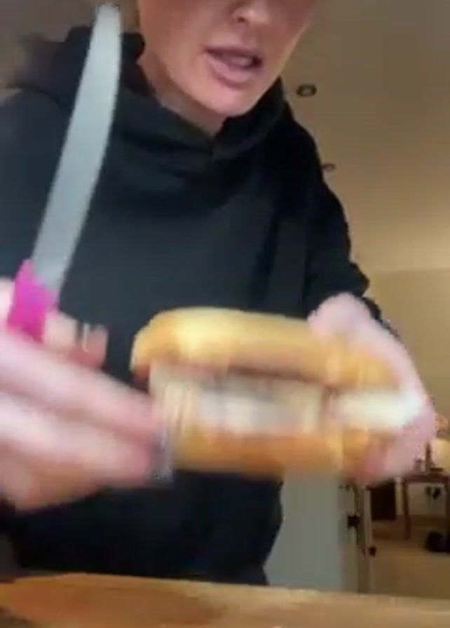 A woman is holding a sandwich in front of her. She is wearing a black hoodie. She has dark hair and dark fingernails. She is standing in a kitchen with a wooden counter. In her right hand, she is holding a serrated knife with a pink handle. The sandwich contains turkey, bacon, and stuffing. The woman says, "Boy, have I got a treat for you. Turkey, bacon, stuffing."