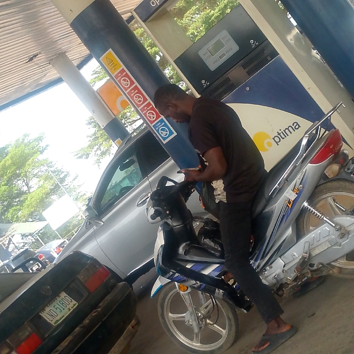 The image depicts a daytime scene at a fuel station in Karmajiji, Nigeria
