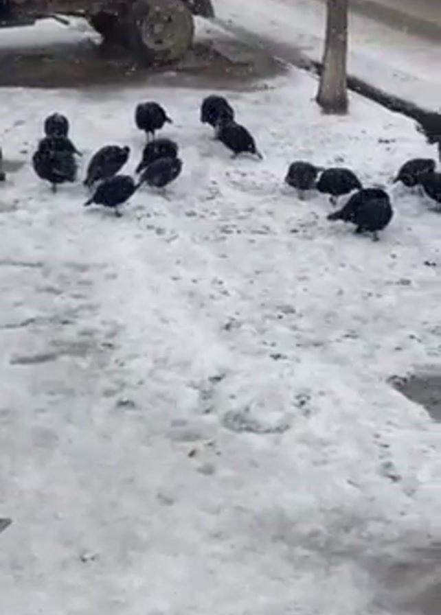 A flock of black turkeys forage in the snow-covered ground on a snowy day. The ground is partly covered with snow, and some patches of pavement are visible. A small red trailer is parked on the side of the street in the background, next to a bare tree. It is snowing steadily.