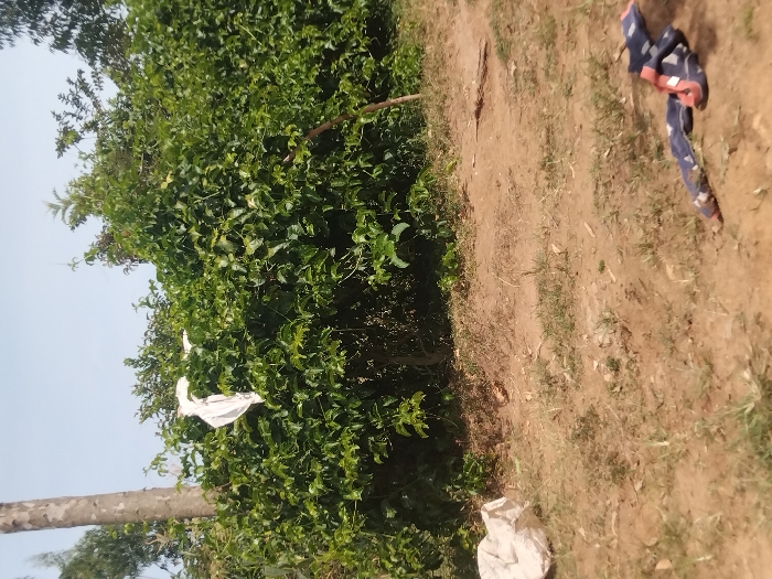 A vibrant bush filled with dense foliage dominates the left side of the image. Some trash is caught in the branches. Bare ground mixed with patches of grass covers the right half. A piece of cloth lies discarded on the ground. In the background, a clear sky is visible above the lush greenery. A tree trunk appears at the bottom-left. More white trash is visible by the road at the bottom.