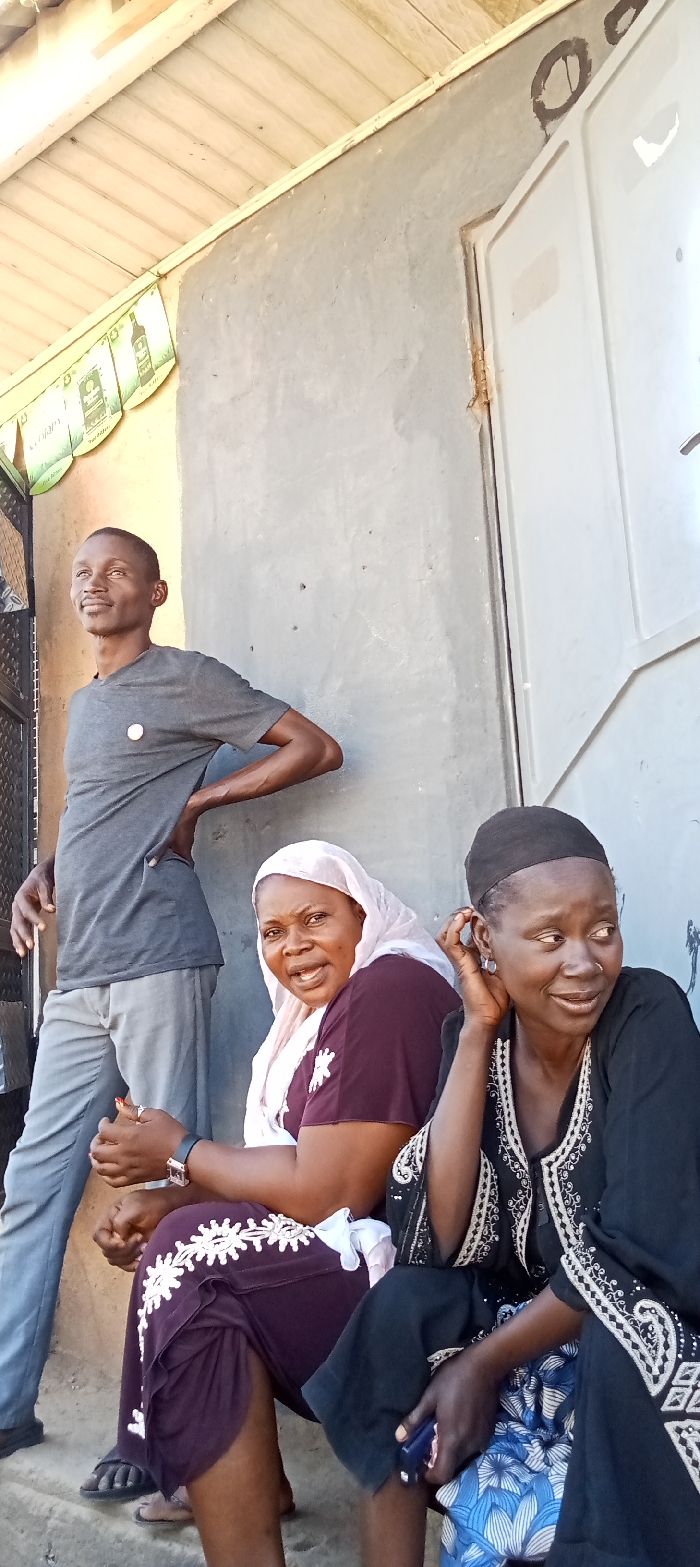 This image captures a scene in Narayi, Nigeria, featuring three individuals against an exterior building wall under a wooden overhang