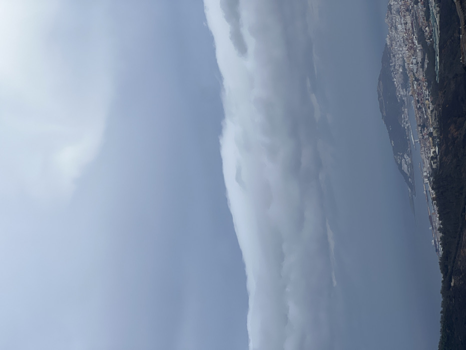 An elevated panoramic view captures the coastal city of Bni Mzala, Morocco, under a heavily overcast sky. The upper two-thirds of the image depict dense layers of grey and white cumulus clouds, with a prominent horizontal band of white cloud stretching across the mid-upper frame. Below the cloud layer, a dark blue-grey body of water, likely the sea, meets a curving coastline. The city occupies the coastal plain and extends up the lower slopes of adjacent hills, characterized by numerous white and light-colored buildings tightly packed together. A visible port or harbor area is discernible along the coast, featuring docks and multiple ships or vessels. A significant hill or small mountain covered in urban development and some vegetation rises from the city on the right side. The immediate foreground, at the bottom of the image, shows dark, rugged terrain consistent with vegetated hills, indicating the high vantage point from which the photograph was taken. No individuals, specific actions, or interactions are visible.