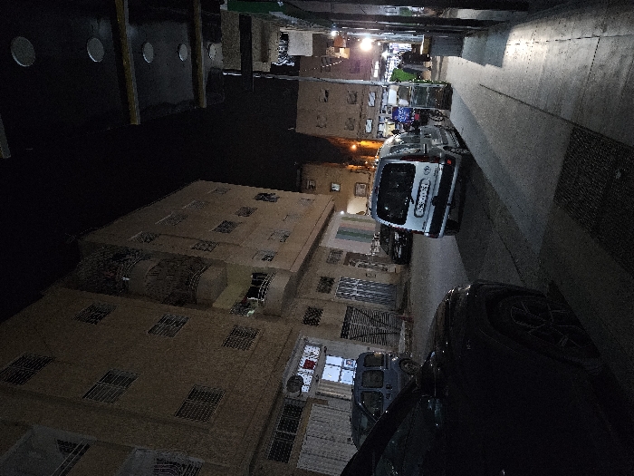 The image displays a nighttime street scene in an urban area of Fez, Morocco, as indicated by the "أ 34" regional code on the Moroccan license plate of a silver van. The scene is primarily illuminated by artificial lights. On the left, a multi-story, light-colored building with numerous windows, some secured with metal grates, and multiple balconies, extends upwards against a dark sky. The ground floor features storefronts, some with visible metal security shutters and illuminated interiors. The street is an asphalt road. In the immediate foreground on the left, a dark-colored SUV or crossover is parked with its hood open, partially obscuring the view of the street. Its front wheel, with a black multi-spoke rim, is visible. Further down the street on the left, a blue panel van is parked. Centrally located on the street is a silver Renault Kangoo panel van, parked parallel to the curb, displaying license plate "53517 | أ 34". Behind this vehicle, another dark sedan is parked further down the street. On the right, a concrete sidewalk is visible, with a dark rectangular grate embedded in the foreground. A bicycle equipped with a large basket or cart is parked on this sidewalk in the mid-ground. Further along the sidewalk in the background, several indistinct human figures are present near illuminated shop entrances or building facades. An overhead structure with circular recessed lights extends above the right side of the sidewalk. The general ambiance is that of an active residential and commercial street at night.