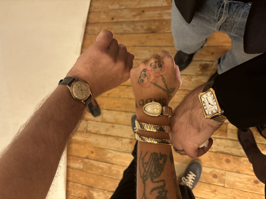 Three people display wrists adorned with wristwatches. The left wrist sports a gold watch with a dark gray band. The center wrist features an oval watch with small gemstones and is accompanied by three gold bracelets. The right wrist displays a rectangular gold watch with a white face. The center wrist is tattooed with red floral designs and the word "Daddy." Footwear and clothing of the wearers are partially visible. The background reveals a light-colored floor and a section of a wall.