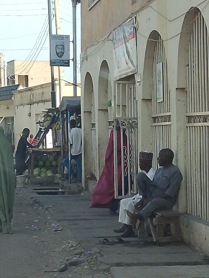 A street scene shows two men sitting in front of a building with arched walkways and bars. One man is on a wooden stool. A vendor with watermelons sits across the street, while a person in a long green robe walks by. A sign with a man's portrait hangs on a pole. Debris litters the street.