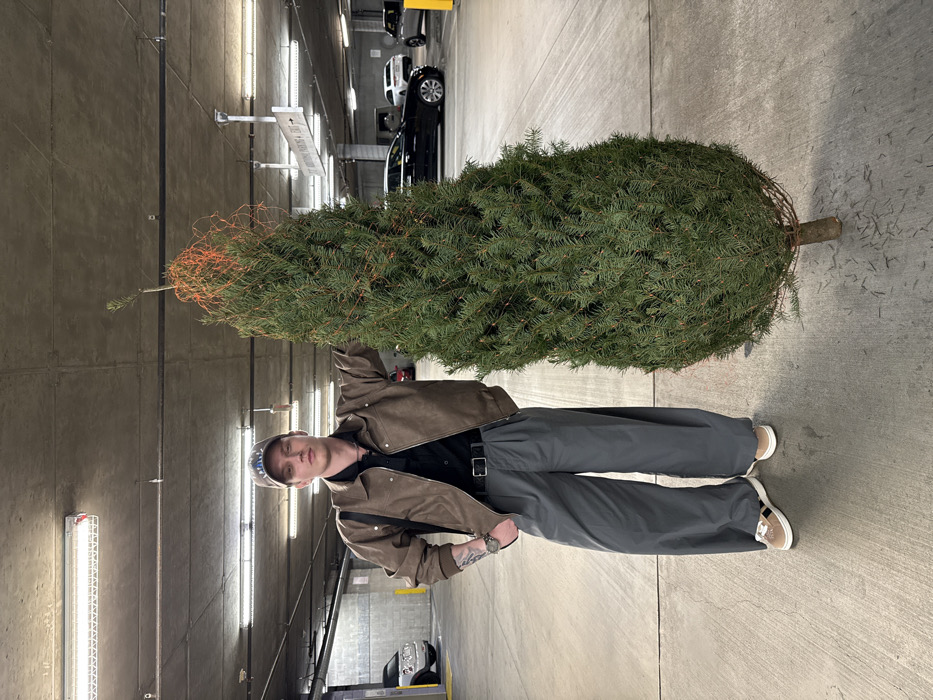 A man stands in a parking garage, holding a large Christmas tree over his head