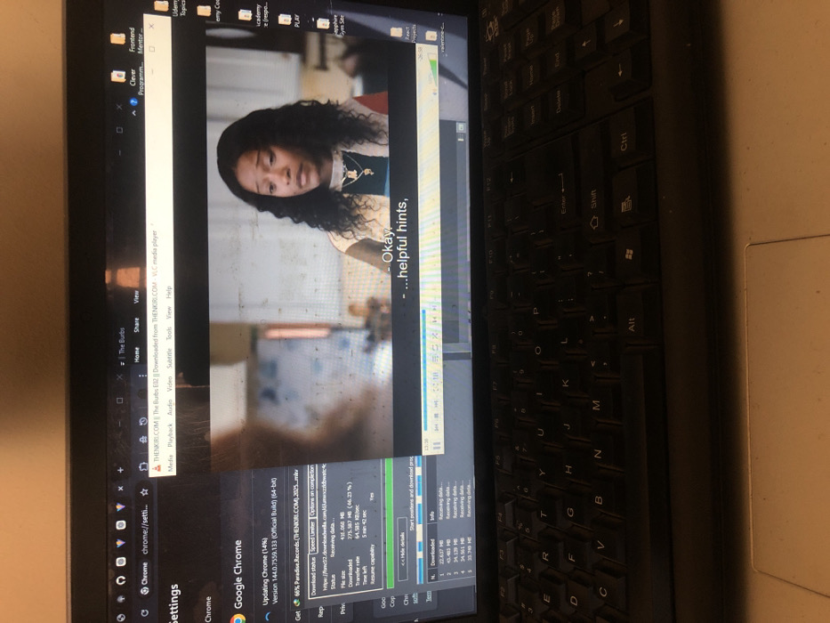 A black laptop computer is displayed in an indoor setting in Abuja, Nigeria, with its screen showing two primary applications. On the left side, a Google Chrome browser window labeled "Settings" shows a "Updating Chrome (14%)" notification. Below this, a download interface indicates a file named "Paradise.Records.(THENKRL.COM).2023_.mkv" is 66% complete, downloading at 64,585 KB/s with 5 minutes 42 seconds remaining from the source "funk02.downloadwella.com". Several other downloads are listed as "Receiving data...". On the right side of the laptop screen, a VLC media player is active, playing a video titled "The Burbs E02 || Downloaded from THENKRL.COM". The video frame shows a female individual with dark, curly hair, wearing a multi-colored top and layered necklaces, looking with a focused expression. Subtitles "Okay, ...helpful hints," are visible at the bottom of the video. The laptop screen itself exhibits numerous small specks, consistent with dust or minor smudges. Below the screen, the laptop's black QWERTY keyboard and touchpad are partially visible. The device rests on an unidentifiable flat surface.