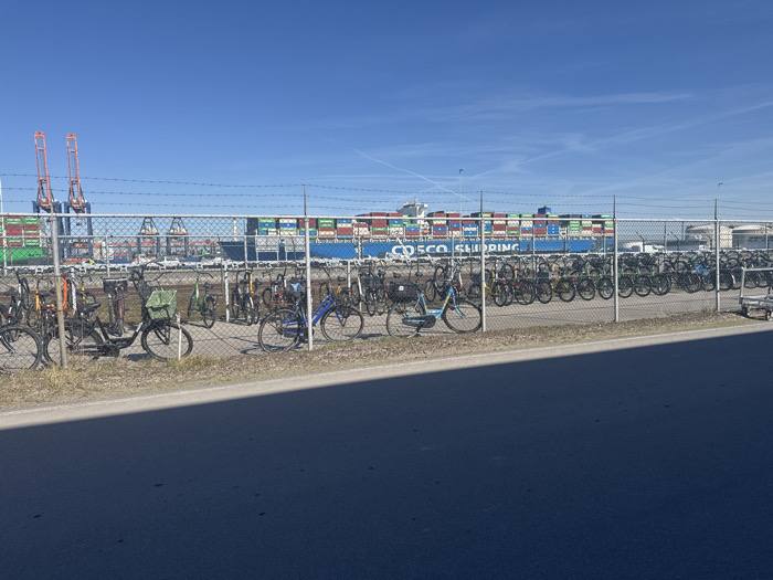 This image depicts an industrial port scene at Maasvlakte, Rotterdam, Netherlands, under a clear blue sky. In the immediate foreground, a dark asphalt surface is visible, partially obscured by shadow. A chain-link fence, topped with multiple strands of barbed wire, spans horizontally across the midground, separating the foreground from the port activities. A narrow strip of dry grass and dirt lies along the base of the fence. Numerous bicycles of various styles are parked tightly along the fence, forming a dense, continuous row from left to right, indicating a significant bicycle parking area. On the far right, a small, two-wheeled grey trolley is positioned near the fence. Through and beyond the fence, a large blue container ship, prominently labeled "COSCO SHIPPING," dominates the background. The ship is heavily loaded with multiple tiers of multicolored shipping containers. To the left of the ship, several large, orange gantry cranes are visible, characteristic of a container terminal. Further port infrastructure, including additional stacked containers and industrial structures, can be observed in the distance, particularly to the right of the ship. No individuals are visible in the scene. The overall environment is one of bustling industrial activity within a port setting.