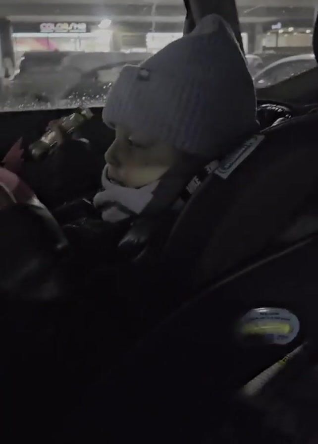 A baby in a car seat is riding in a car. The baby is wearing a gray beanie, a white scarf, and a black jacket. The car is in a parking garage. The baby is looking out the window. The video is shot from inside the car, behind the baby. The lighting is low. There's music playing in the background. The baby is still and quiet.