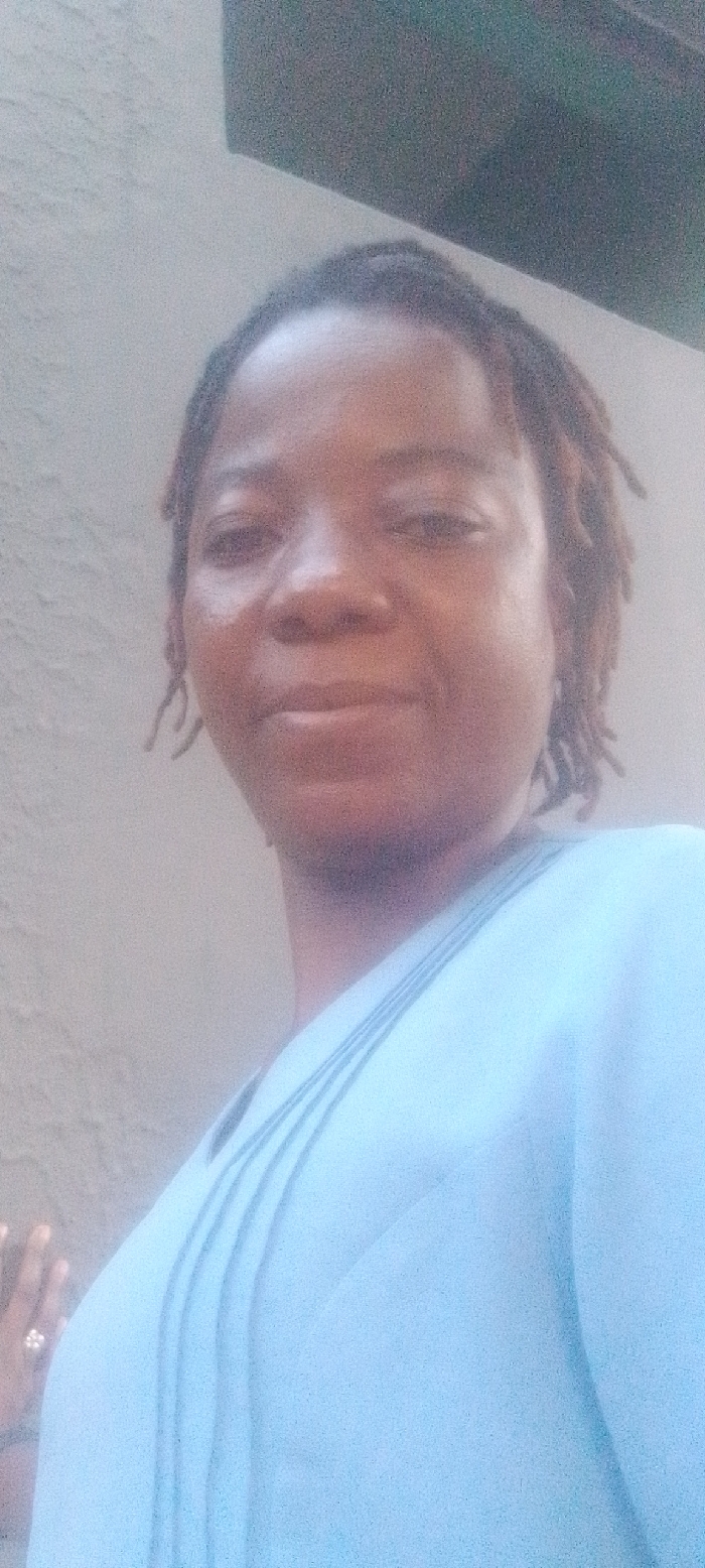 A woman with dreadlocks is looking directly at the camera. She is wearing a light blue top with a pleated design. Her skin tone appears medium brown, and her expression is neutral. A portion of her left hand and a ring are visible on the lower left side of the frame. The background is a plain, light-colored wall with a dark area above. The image's lighting is somewhat muted, giving it a soft appearance.