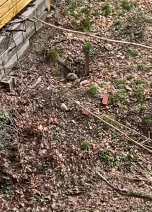 patch of ground covered in dead leaves and sparse grass. A wooden fence with a low concrete border runs along the top of the frame. There is a hole in the ground with a couple of light-colored rocks nearby. Two pieces of red brick are also visible. Some thin branches are strewn across the ground.