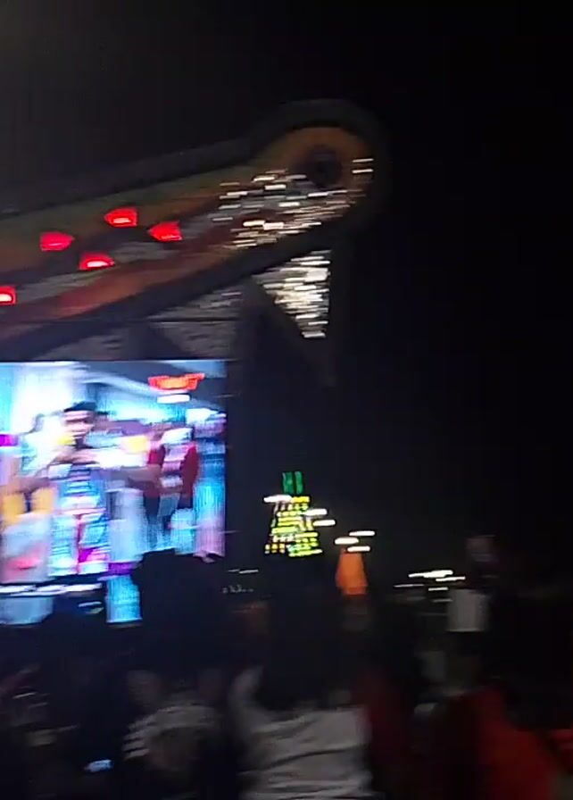 crowd of people at an outdoor event at night. In front of the crowd is a large screen displaying a video of several men. Above the screen is a decorative archway with red lights. Many people in the crowd are holding up their phones, presumably to record or take pictures. The crowd seems to be focused on the screen, suggesting they are watching a performance or event.