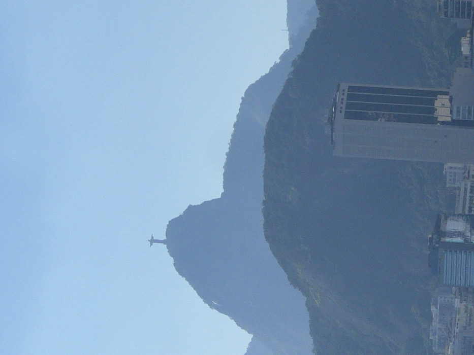 A hazy landscape shows the iconic Christ the Redeemer statue atop Corcovado Mountain