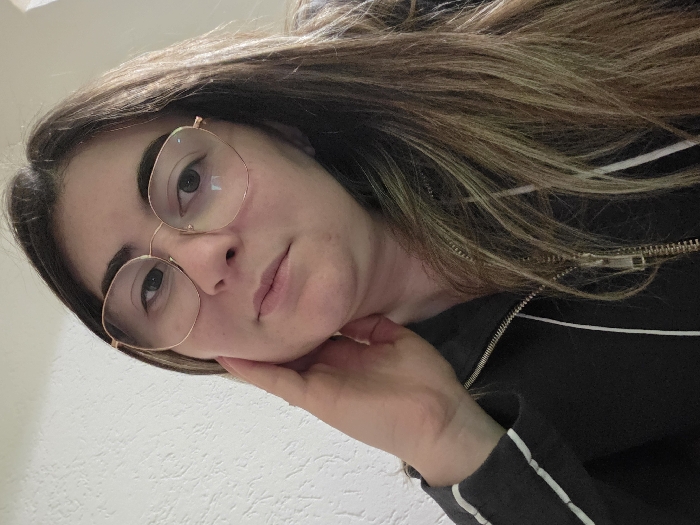 A close-up, indoor portrait photograph depicts an adult female situated in Negorci, North Macedonia. The subject has fair skin, dark eyebrows, and dark eyes, and is wearing round, thin-framed gold-colored eyeglasses. Her long, straight to wavy hair is brown with lighter, possibly blonde or light brown, streaks and is parted on the viewer's left. She is dressed in a dark-colored jacket or hoodie with a visible metallic gold-colored zipper running down the front; a white stripe is visible on the upper arm area of the garment on the viewer's right. The subject's left hand (viewer's right) is raised, with the palm and fingers resting against her neck and jawline. She is looking directly towards the camera. The background consists of a light-colored wall with a textured finish.