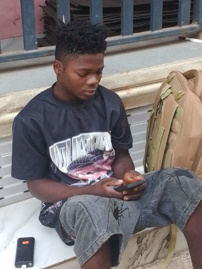In the city of Unknown, Unknown, a male individual with dark skin and short, textured black hair is depicted seated, focusing on a black smartphone held in both hands