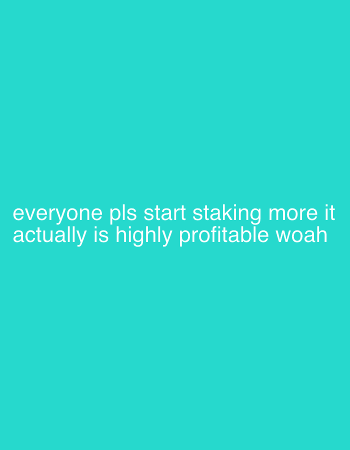 - "The image is a solid turquoise background with white text at the bottom that reads, "everyone pls start staking more it actually is highly profitable woah" by FM-13LyK2, licensed under CC BY 4.0