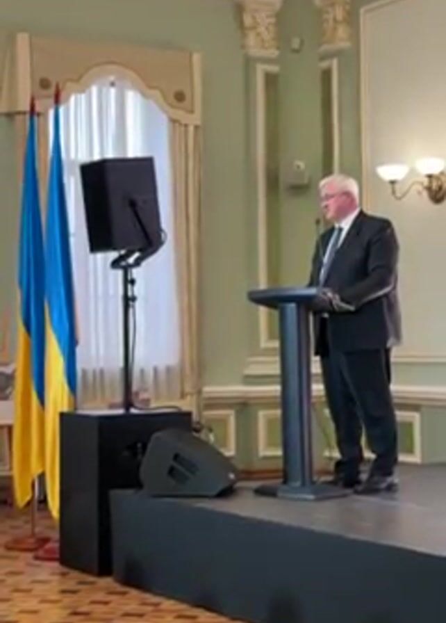 A man standing at a podium is speaking in a room where two Ukrainian flags are visible to the left of the podium. The man is white, has short, grey hair, and is wearing a black suit and tie. He has glasses and is holding papers. He is standing on a black, raised platform with a dark grey, black podium. There are two speakers to the left of the podium. The room has light green walls, a patterned floor, and white trim and moldings. A wall sconce is visible to the right. The man appears to be giving a speech.