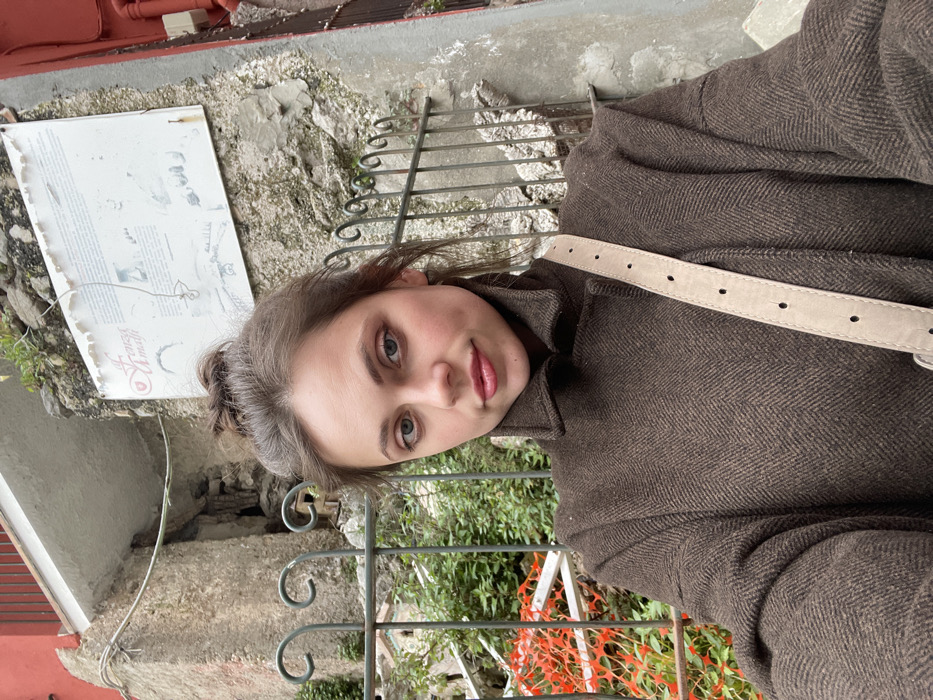 A female subject is depicted in a close-up, chest-up selfie. She has brown hair pulled into a bun, a light complexion, and blue-grey eyes with visible eyeliner, mascara, and pink lip color. She wears a dark brown, herringbone-patterned wool coat featuring a prominent collar. A light beige, perforated strap, likely from a bag, crosses diagonally over her right shoulder. The background consists of a textured, weathered stone wall with a partially obscured white informational sign. The sign clearly displays "A Pogerola..." and "Amalfi," identifying the location as Pogerola, Italy. To the left, a section of an old building with a red-orange upper facade is visible behind a dark metal fence with decorative scrollwork. Green foliage and bright orange flowering plants are present behind the fence, where orange mesh fencing is also visible. To the far right, a red-orange building wall with a white pipe system is evident. The scene is illuminated by diffused natural light.