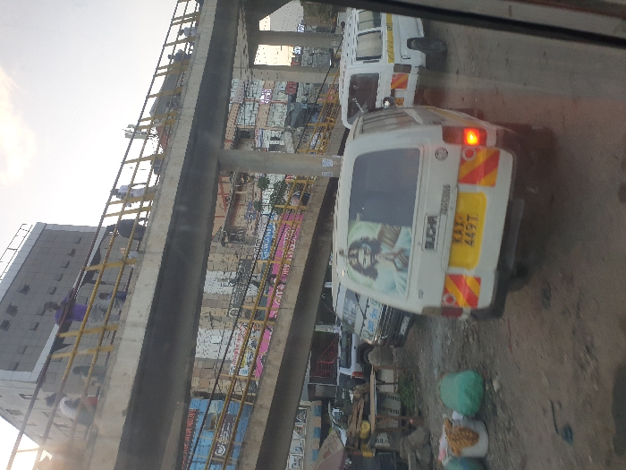 An urban scene features an elevated walkway bustling with pedestrians. Below, congested traffic includes a white van with a prominent image of Jesus on the rear door, its license plate reading "KXX 449T." The setting appears to be a busy marketplace, indicated by scattered goods and informal stalls lining the roadside. The overall impression is one of vibrant urban life, juxtaposing religious imagery with the everyday realities of a crowded city.
