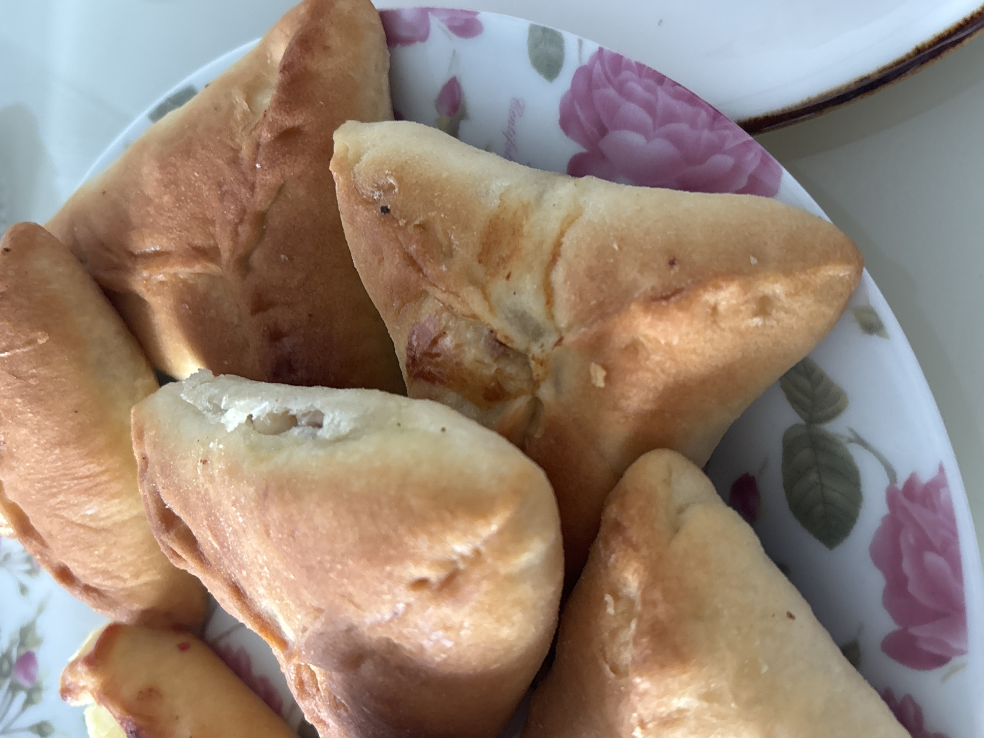 A close-up shot presents a collection of golden-brown, triangular pastries arranged on a plate decorated with pink roses. The pastries appear to be baked, with visible folds and textures on their crusts. The plate is white with a floral design, and a portion of another plate is visible in the background. The location and city details are not discernible from the visual information provided.