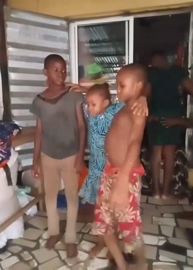 The video features three children posing for the camera. A taller boy in a grey t-shirt and khaki pants stands to the left. A girl in a blue patterned dress stands in the middle, leaning into the boy to her right. A second boy, shirtless and wearing floral shorts, sits on a chair, with his arm around the girl. Behind them, an adult woman in a green dress stands in a doorway, partially obscured. The scene takes place in what appears to be a covered patio or porch area, with corrugated metal walls and a tiled floor. A pile of clothes and a stick lean against the wall to the left.