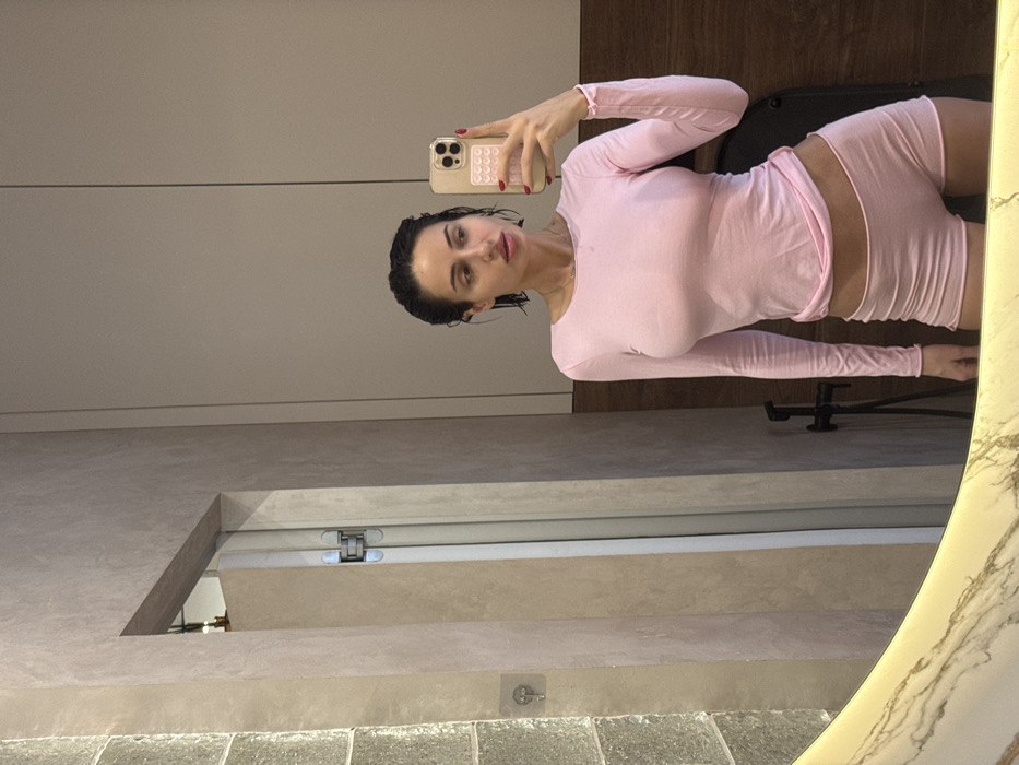 A female individual is depicted taking a mirror selfie in a domestic interior, identified as being in the city of Khimki, Russia. The individual, with dark, damp-appearing hair styled back, is wearing a light pink long-sleeved top and matching light pink short shorts. She holds a light-colored smartphone, featuring a light-colored, possibly silicone, accessory with a grid pattern on its back, in her right hand, positioning it to capture her reflection. Her fingernails are painted red. The environment includes a large, horizontally oriented oval mirror with an illuminated edge and a cream-colored, possibly marble-patterned frame in the lower foreground. The background consists of varied wall textures: a light grey, textured block-like wall section on the far left, a smooth, light beige wall with a doorway visible behind the individual, and a dark wooden panel on the far right. A dark-colored plumbing fixture, consistent with a bidet spray or shower head, is visible mounted on the wall to the individual's right. A small, light-colored wall hook is present on the left wall section.