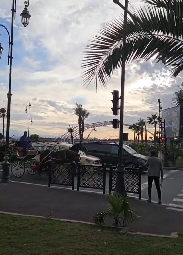 The camera shows a busy city street scene. A horse-drawn carriage, carrying passengers, passes by in front of various cars and a pedestrian waiting to cross the street. The carriage is green, with two dark horses pulling it. The driver is wearing a blue outfit. Cars are lined up at a traffic light, including a black van and several taxis. Palm trees and ornate streetlights line the sidewalk. A person in a grey jacket stands near a zebra crossing, waiting for traffic. In the background, there are buildings under construction and distant mountains can be seen against a partly cloudy sky, suggesting it's early evening or late afternoon. A fence separates the street from a grassy area in the foreground.