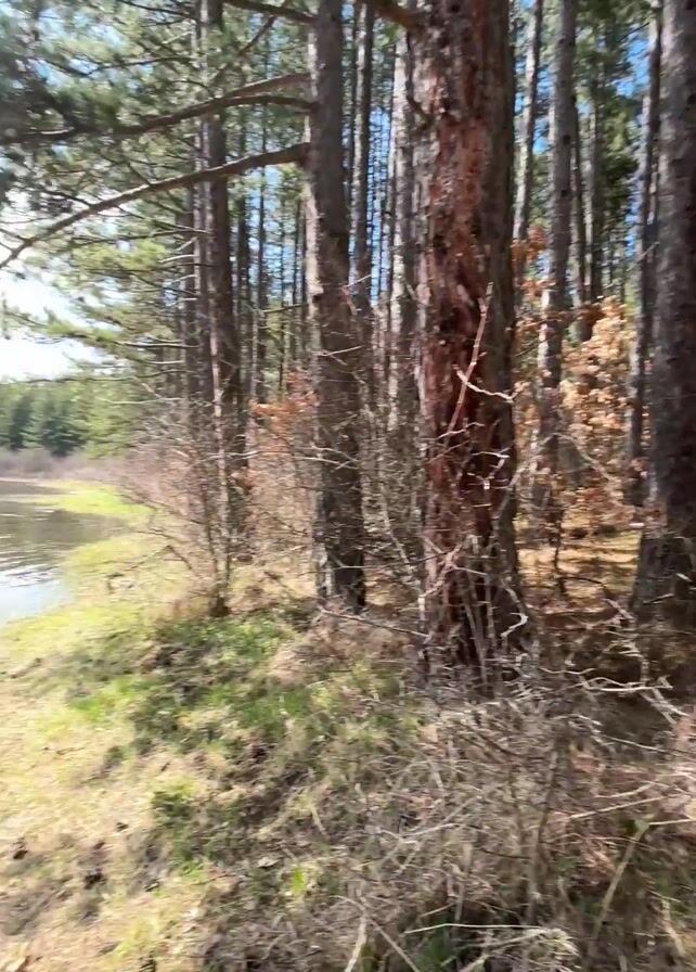 The camera pans from a dense forest of tall, thin trees to reveal a wide body of water, likely a lake