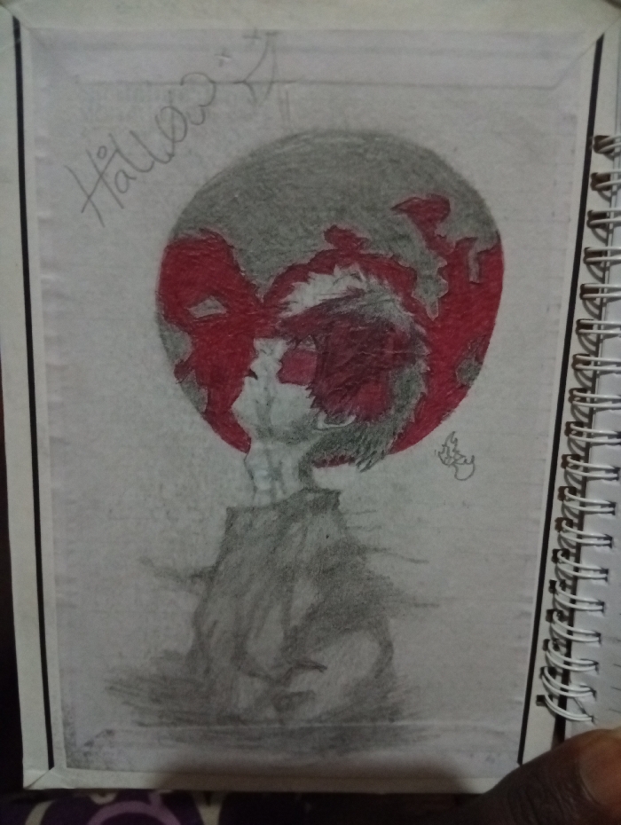 A pencil sketch depicts a figure with a large, red-accented circle behind the head, possibly resembling a blood moon