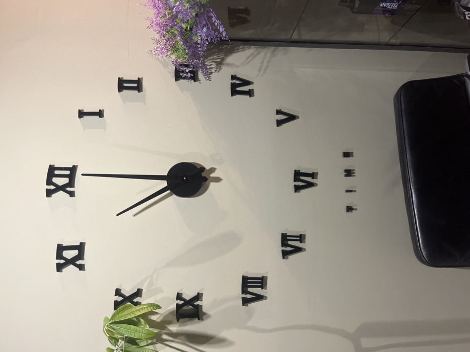 The scene is located in Etropole, Bulgaria. The image depicts an indoor environment focused on a light-colored wall (off-white/beige) featuring a large, decorative wall clock. The clock consists of individual black three-dimensional Roman numerals (I through XII) adhered directly to the wall, with a central black circular mechanism and two black hands. Both the hour and minute hands point directly upwards towards the XII, indicating a time of 12:00. Below the clock's center, between the V and VII numerals, the word "TIME" is spelled out in individual black letters. To the left, a portion of a living plant with large, green leaves is visible, casting a distinct shadow on the wall. To the right, a cluster of purple artificial flowers is visible. Adjacent to these flowers, along the right edge of the frame, a dark, reflective glass cabinet is partially visible, containing at least one bottle labeled "COLOGNE". The top portion of a black, possibly leather, chair or seating surface is present in the lower foreground, partially obscuring the wall and clock's lower elements. Shadows are cast on the wall by the clock components and the plant, suggesting a light source from the upper left. No individuals are present in the frame.