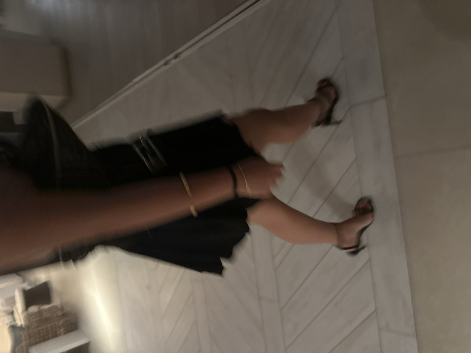 An interior, motion-blurred photograph depicts a person in mid-stride, moving from left to right, on a light-colored floor in the city of Ibiza, Spain. The individual wears a dark, short-length dress or skirt with a visible scalloped lower hem and dark, thin-strapped, high-heeled sandals. Red nail polish is discernible on the toes. The left forearm and hand are partially visible, adorned with two gold-toned bangle bracelets and a dark wristband, along with a thin gold-toned chain bracelet on the wrist. A dark-colored bag or purse with a metal buckle or hardware is partially visible, carried on the individual's right side. The floor is composed of light-toned, possibly white or light grey, rectangular tiles arranged in a chevron or herringbone pattern in the foreground, with a horizontal demarcation line separating it from a plainer tiled area. The blurred background features indistinct furniture on the left, suggestive of a lounge area, and a plain, lighter-toned vertical surface on the right.