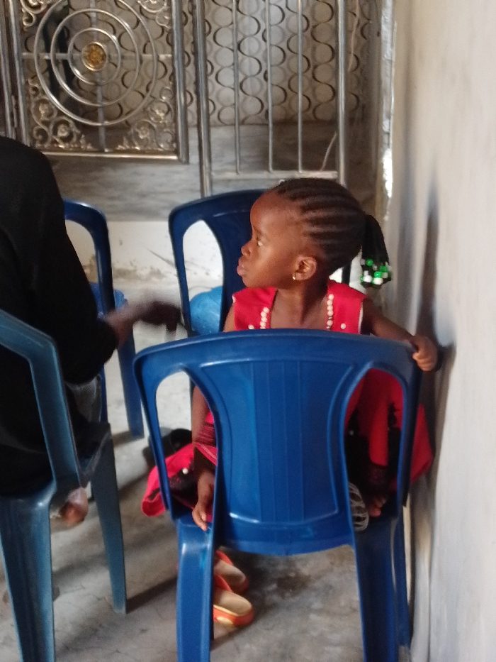 A young girl with braided hair and a red dress sits on a blue plastic chair, looking to the left. She wears an earring and has green and white beads in her ponytail. Beside her is another blue plastic chair occupied by a person wearing black. More blue plastic chairs are in the background. The floor is gray, and orange shoes are visible under the girl's chair. A metal door with a decorative design and a white wall are also visible.
