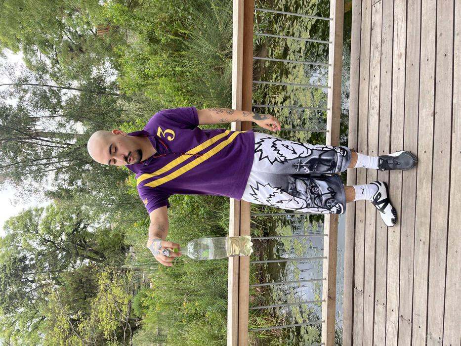 - "A man with a shaved head, wearing a purple and gold polo shirt, patterned shorts, and Puma shoes, stands on a wooden bridge" by FM-dFHXv1, licensed under CC BY 4.0