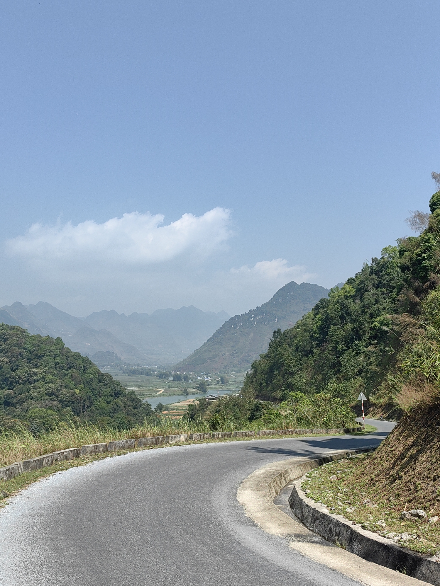 winding asphalt road cutting through a mountainous landscape. The road curves sharply to the right. The road is bordered by concrete barriers and drains. Lush green vegetation covers the hillsides on either side of the road. In the distance, a valley is visible, with hazy mountain ranges fading into the horizon under a blue sky with scattered clouds. A lake and some buildings can be seen in the valley. There is a road sign on the right side of the road. The location is identified as Lùng Tám Commune, Vietnam.
