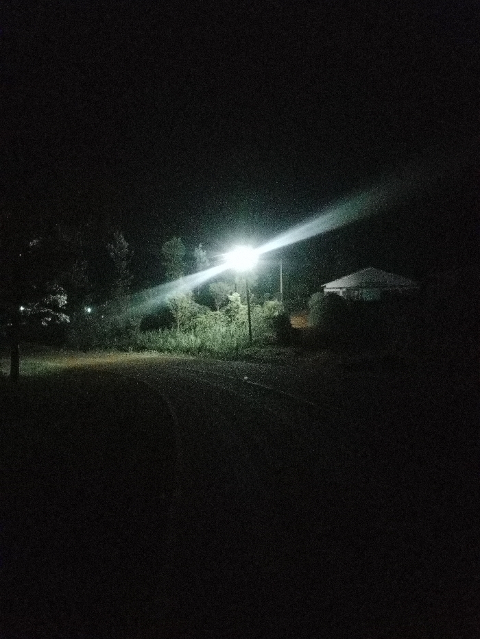 The image displays an outdoor night scene in Karuri, Kenya. A single, intensely bright street light, mounted on a utility pole, is centrally positioned, emitting a strong, diffused beam of light. Dense, dark green vegetation, consisting of bushes and trees, frames the illuminated area and extends into the background. In the upper right background, a building with a distinct light-colored, sloped roof is partially visible, largely obscured by the darkness and surrounding foliage. The foreground consists of a dark, unpaved or gravel path or road, exhibiting faint linear indentations or tracks. A small, light-colored object rests on the ground in the mid-right foreground. No individuals are present in the visible area.
