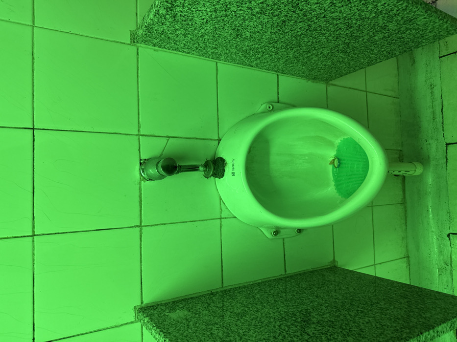 - "An overhead shot of a white urinal, complete with a green urinal screen, is centered on a tiled wall, with granite-like shelves above and below it" by FM-x5Zlm1, licensed under CC BY 4.0