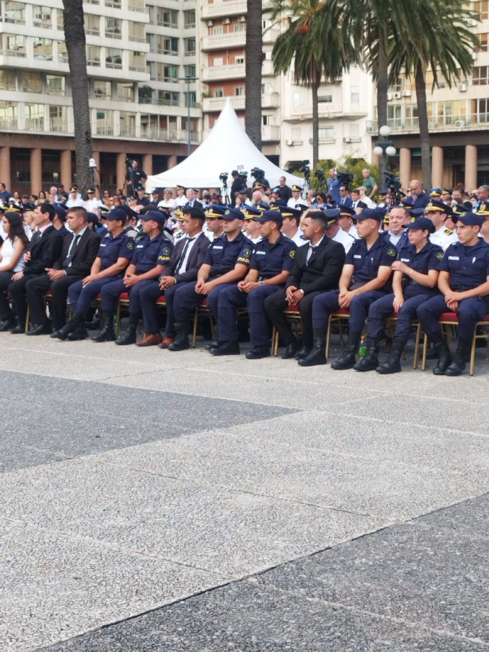 A seated group of uniformed individuals, likely law enforcement officers, face forward outdoors. They wear navy blue uniforms with hats and boots. Behind them, a crowd gathers in front of tall buildings and palm trees. A white tent-like structure stands in the background. A combination of men and women populate the seating area, seemingly for an official event. The scene takes place in a plaza.
