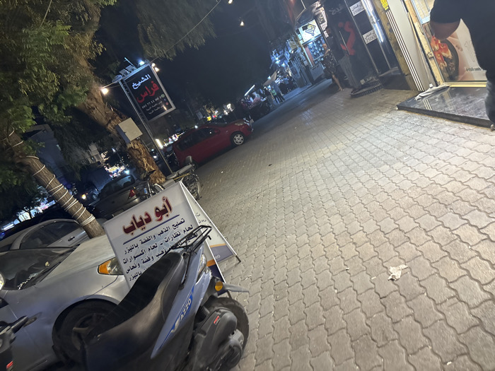 The image depicts a nighttime view of a commercial street within Barza Municipality, Syria. The foreground features a light-colored, interlocking paver sidewalk. A light-blue Kymco Agility 50 scooter is parked on the sidewalk, with its rear facing the viewer. An A-frame sign, displaying "أبو دياب" (Abu Diab) and advertising gold and silver manufacturing and welding services in Arabic, stands behind the scooter. To the left, a silver sedan is parked, followed by a red sedan further down a narrow street or alleyway. An illuminated sign on a pole to the left displays "الشيخ فراس" (Al-Sheikh Firas) in Arabic, with associated text. The midground and background reveal multiple illuminated storefronts lining both sides of the street, indicating retail activity. Several indistinct human figures are present, either walking or standing on the sidewalk and within the vicinity of the shops. A partial view of an individual's torso and arm is visible on the far right edge of the frame. A broom is positioned near a storefront entrance on the right. Artificial lighting, including overhead fixtures and shop illumination, casts light across the scene. Trees with wrapped trunks are visible on the left side of the frame.
