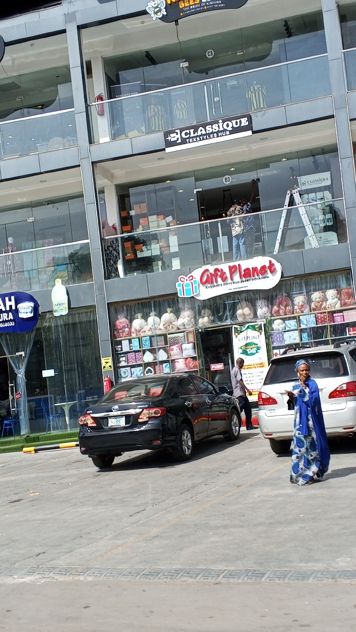 The scene depicts a multi-story commercial building in Kabala, Nigeria, under daylight conditions. The structure features extensive glass facades and grey paneling. On the ground floor, a store named 'Gift Planet' is prominent, marked by a red and white sign reading "EXQUISITE GIFTS FOR EVERY OCCASION." Its display windows exhibit numerous plush toys and various gift boxes. To the left, an adjacent store displays a large yellow bottle prop and blue seating visible through its glass front. A security camera is mounted near the 'Gift Planet' entrance, which has "PUSH" and "PULL" decals on its glass doors. In the paved forecourt, a black Toyota Corolla sedan (license plate KNJ 856) is parked. A silver SUV is partially visible to the right of the sedan. A man in a light-colored shirt and dark trousers walks towards the 'Gift Planet' entrance. In the foreground, a person wearing a blue and white patterned garment stands near the silver SUV, facing away from the camera. A yellow and black striped parking barrier is present on the paved surface. The first floor features a store identified by a black and white sign reading "CLASSIQUE TEXTYLES HUB." Inside, a man stands on a silver step ladder near the glass entrance, appearing to be working. Stacked boxes are visible within this retail space. The second floor displays a sign for "RANCHERS BEES, THE PRIDE OF KADUNA," featuring a bee logo. Striped sports jerseys are visible on display behind the glass windows, and a red fire extinguisher is mounted on an interior column.
