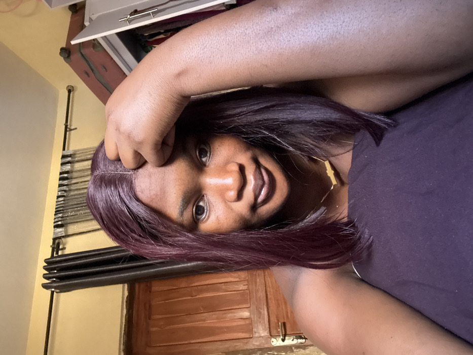 A dark-skinned female individual is captured in a close-up, indoor selfie