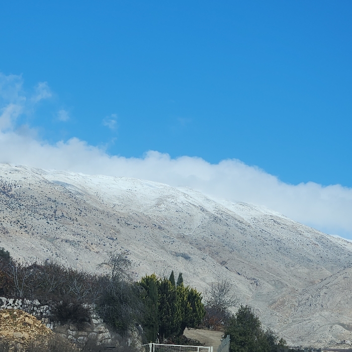 The image displays a snow-covered mountain landscape situated near Majdal Shams, Israel